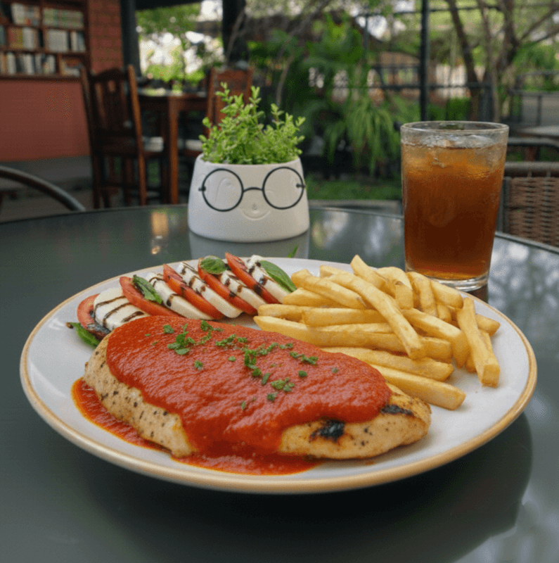 Jugosa pechuga de pollo bañada en salsa napolitana con un toque casero irresistible. Incluyen ensalada, agua panela y papas fritas.